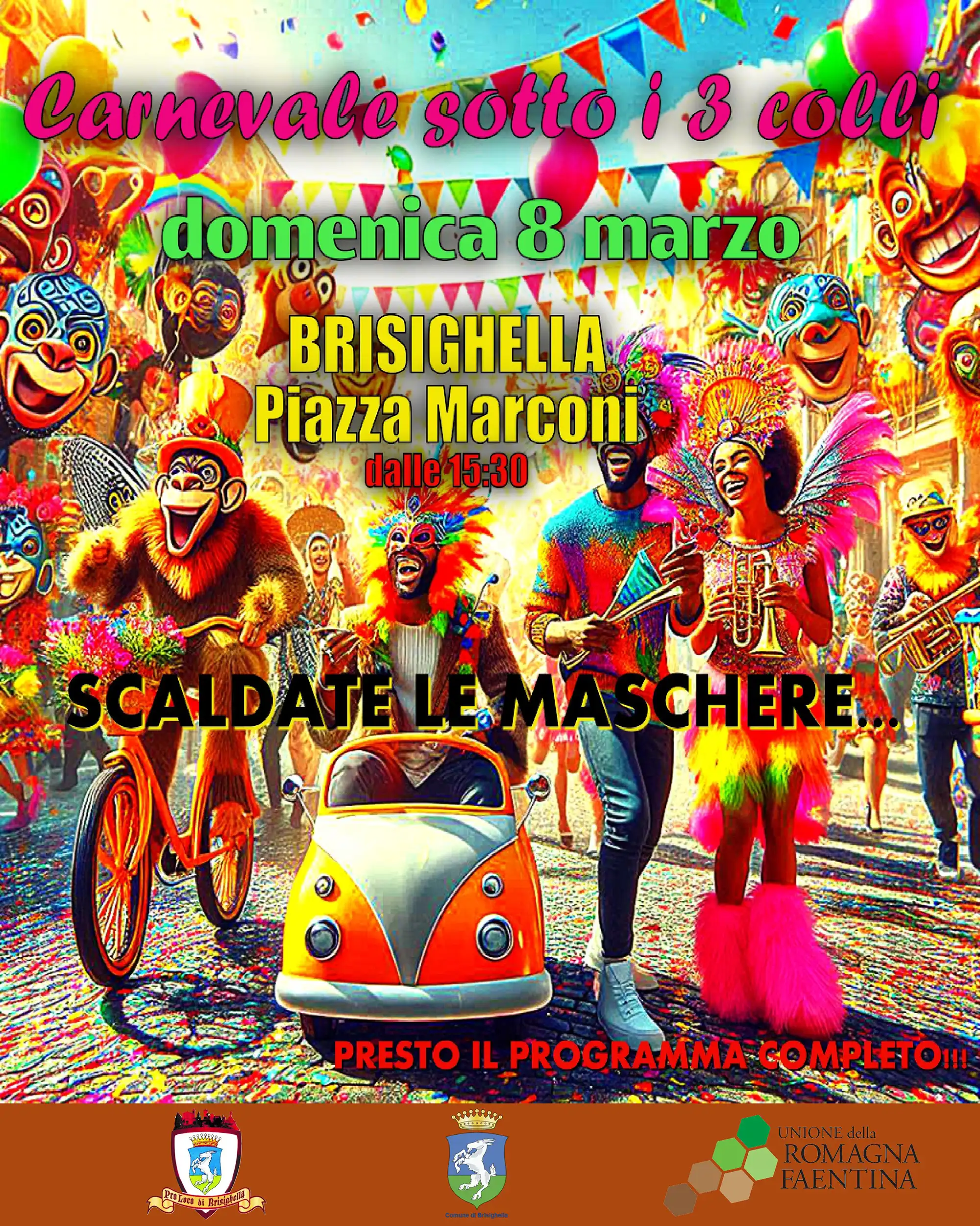 Una sfilata di maschere organizzata in maniera comunitaria che vede scendere in campo ProLoco, i Tamburi di Bisighella, i Luppoli, i Sancti Ruffilli, le scuole Olindo Pazzi di Brisighella e Fognano, con le mamme e i bambini,  i maneggi Cà Stagneto, i Cavalieri dei Calanchi con la sfilata di cavalli in maschera e gli esercenti che allestiranno la Piazza con aperitivo da passeggio, ideale per gustare drink e stuzzichini itineranti tra le bellezze del Borgo.